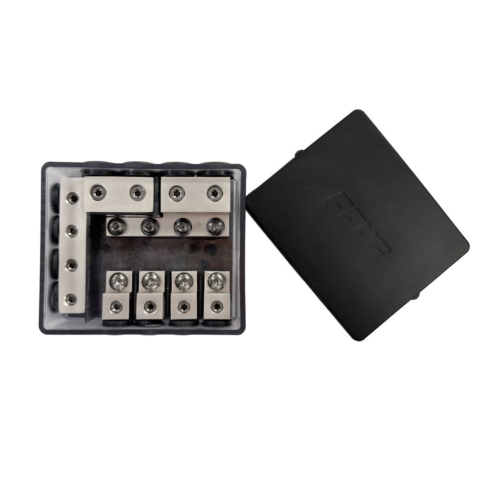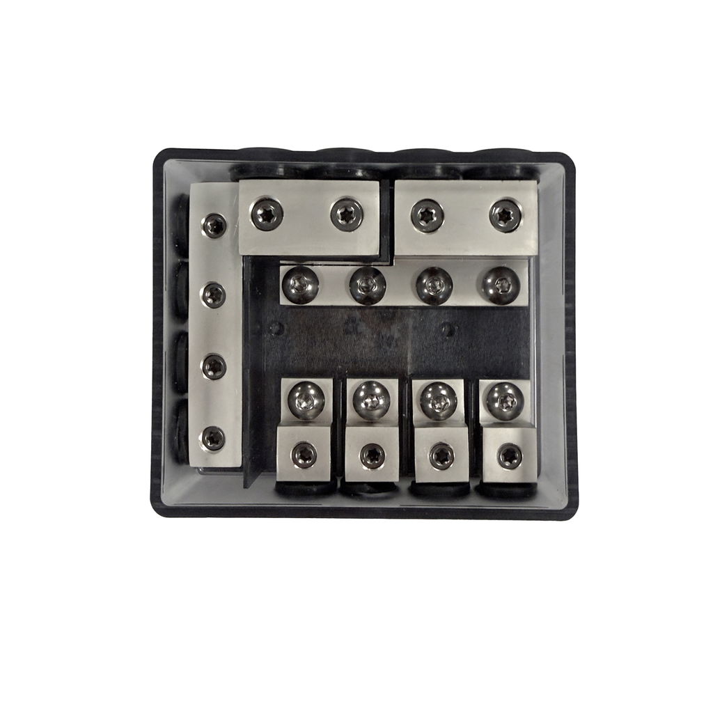 Stänksäker mini-ANL-säkringshållare av hög kvalitet. Inuti finns det 4 platser för mini ANL-säkringar. Denna produkt kombinerar både ett kraftdistributionsblock och ett markfördelningsblock i ett.