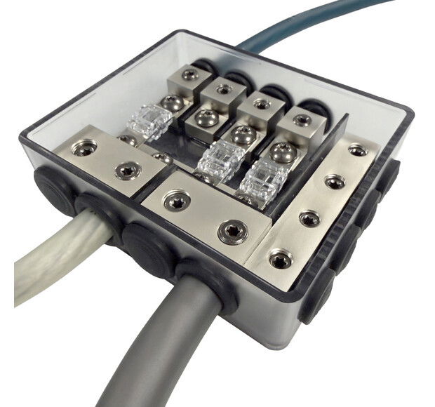De andra två 50 mm2-ingångarna är konstruerade för jordning (markblocket har inte säkringsplatser). Terminalblocket har 4 stycken med 20 mm2 utgångar.