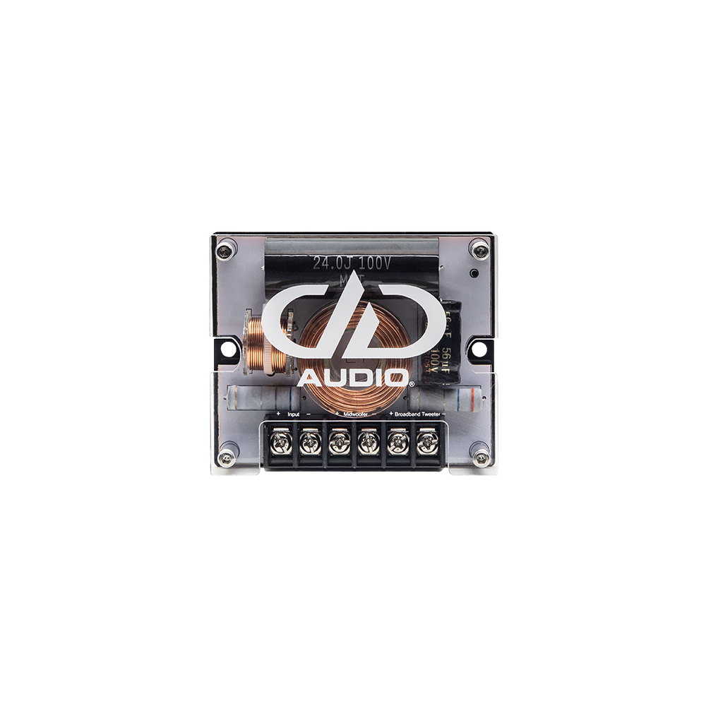 Det genomskinliga akrylskyddet visar precisionskomponenterna och säkerställer platt frekvensrespons och konsekvent fasrespons. Det höga passet är 12dB/oct med en stor volymfilmkondensator och luftkärninduktor. 6,5 midwoofer är 6dB/okt med impedans ersättning.