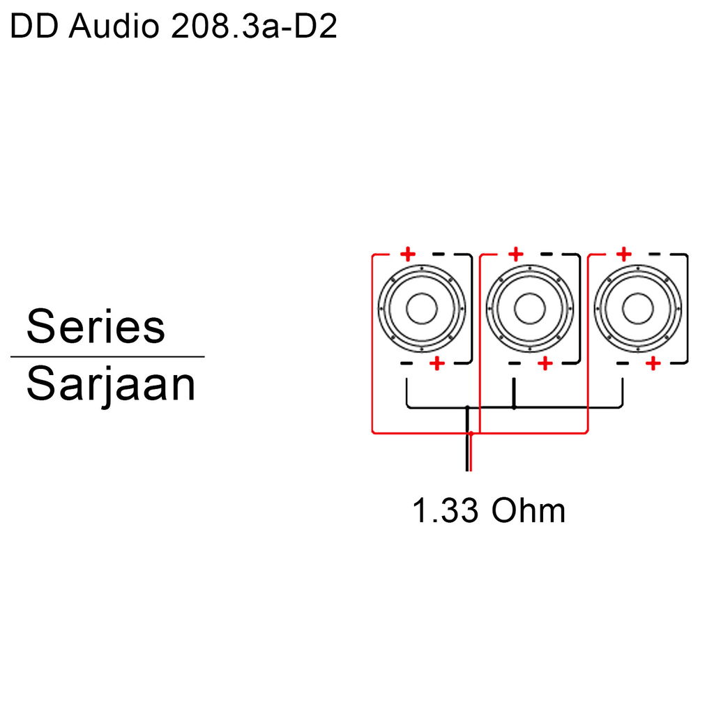 Höljets förpackning inkluderar nödvändiga skruvar och högtalarkablar. Genom att seriekoppla de två talspolarna för varje subwoofer (+ till -) och själva subwoofers parallellt uppnås följande impedans: 1,33.