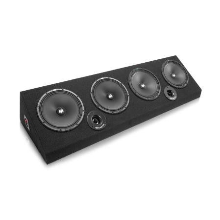 Systemet är anpassat för montering i en LOUD AS HELL 4x8" Raggarplanka Slope – vinklad konstruktion i kraftig MDF, med sidoplacerad terminal och broderad logga. Fyra midbasfästen och två diskanthål gör installationen snabb och flexibel.