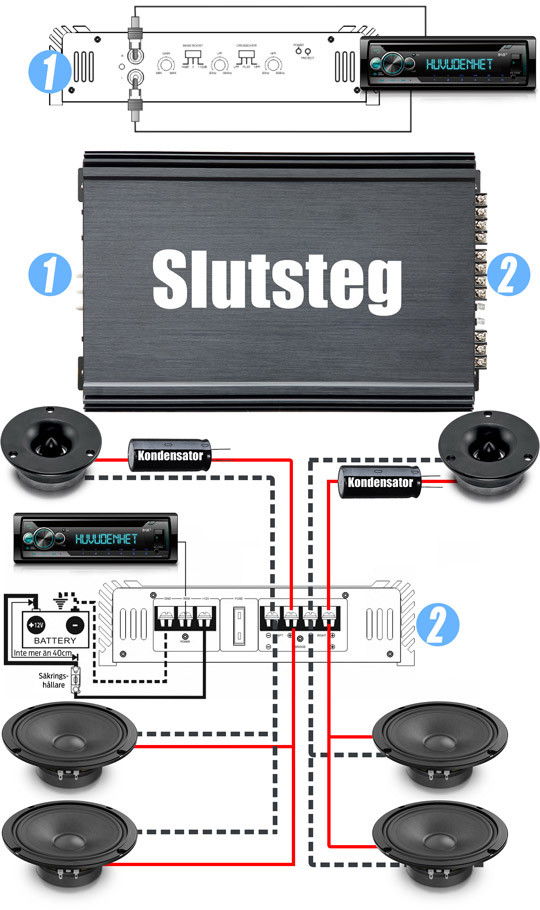 Systemet använder en diskret kondensatorlösning för delning mellan mid och diskant – en enkel men effektiv metod som säkerställer naturlig övergång och pålitlig separation utan att låsa in dig i specifika komponentvärden.